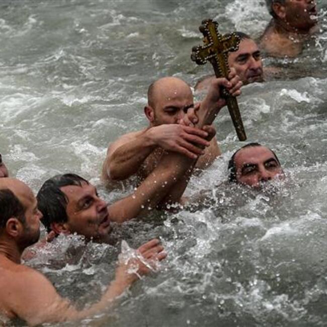 A man holds a wooden cross after retrieving it from the Bosphorus river’s Golden Horn, as part of celebrations of the Epiphany day at the Church of Fener Orthodox Patriarchiate in Istanbul, on Jan. 6, 2015. The Orthodox faith uses the old Julian calendar in which Christmas falls 13 days after its more widespread Gregorian calendar counterpart on Dec. 25. AFP PHOTO / BULENT KILIC