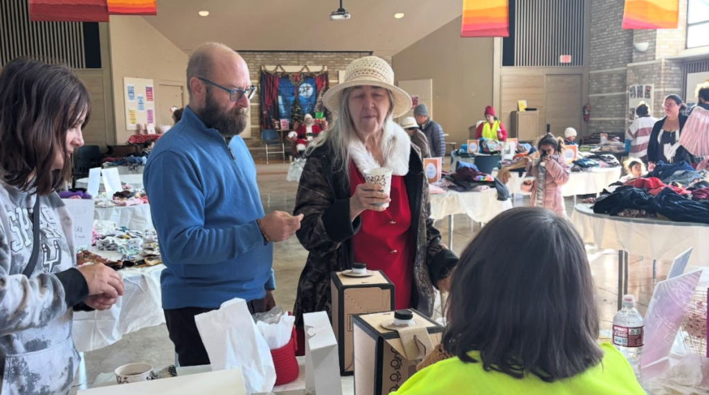 Love in Action at Church of Reconciliation quarterly parking lot, drive-up Food Bank distribution and come-and-take clothing swap with donuts, tacos, and coffee. In December, a special visit from Mr. and Mrs. Claus with free photos for families accompanied the event. Blog author Brandon Beck is shown accompanying Mrs. Claus. Photo courtesy of Brandon Beck